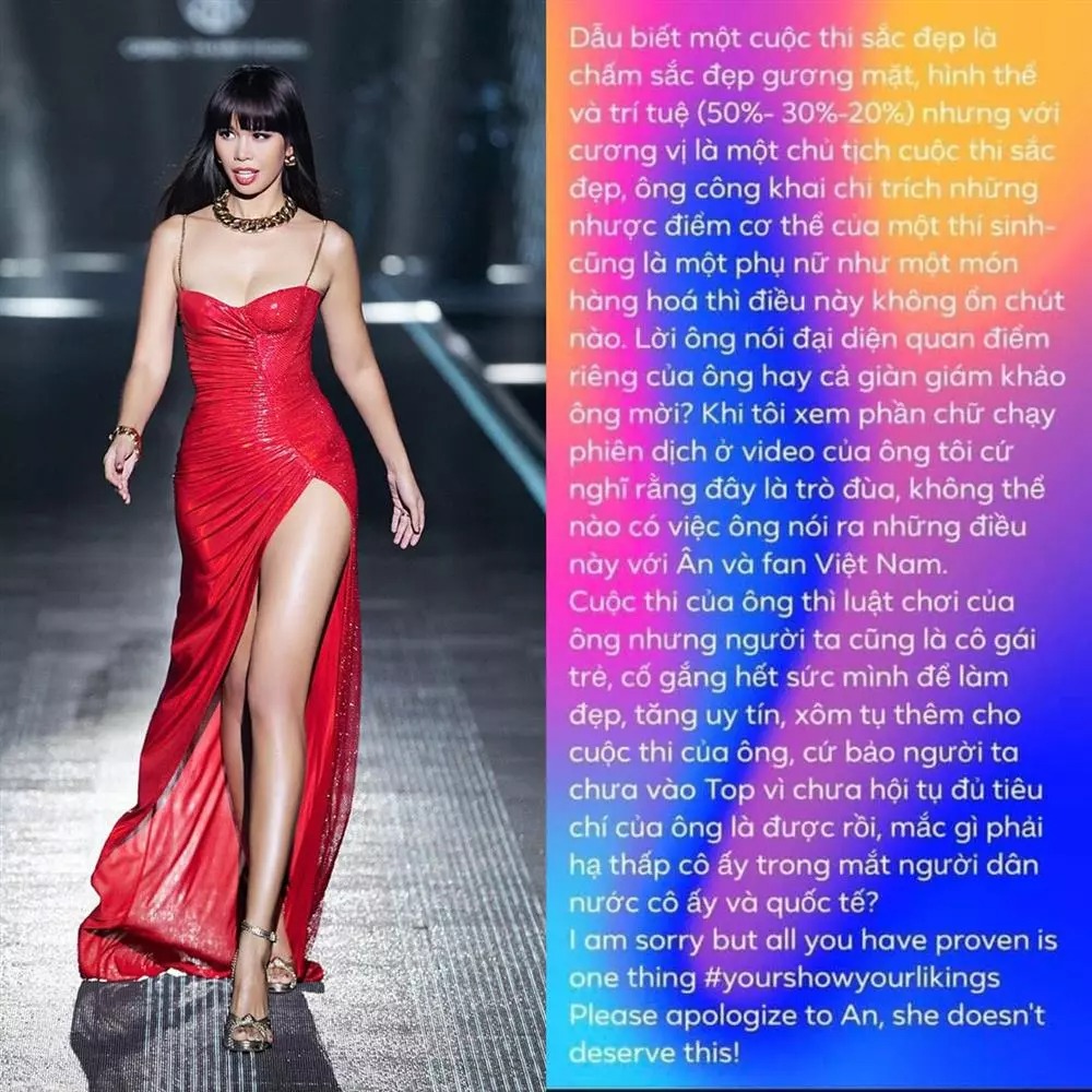 Cuộc thi của ông thì luật chơi của ông, nhưng người ta cũng là cô gái trẻ, cố gắng hết mình để làm đẹp, tăng uy tín, xôm tụ thêm cho cuộc thi của ông. Cứ bảo người ta chưa vào top vì chưa hội tụ đủ tiêu chí của ông là được rồi, mắc gì phải hạ thấp cô ấy trong mắt người dân nước cô ấy và quốc tế?
