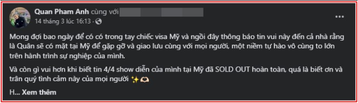 Trên trang cá nhân của Quân A.P, nam ca sĩ cũng chỉ đề cập đến show diễn tại Mỹ trong tháng 4, hoàn toàn không có các chia sẻ liên quan đến loạt đêm diễn với Hiền Hồ như đã thông báo trên poster.