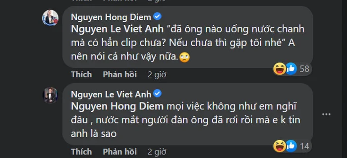 Ngay sau đó, Hồng Diễm cùng hài hước đáp lại Việt Anh rằng: “Đã ông nào uống nước chanh mà có hẳn clip chưa? Nếu chưa thì gặp tôi nhé! Anh nên nói cả như vậy nữa”.
