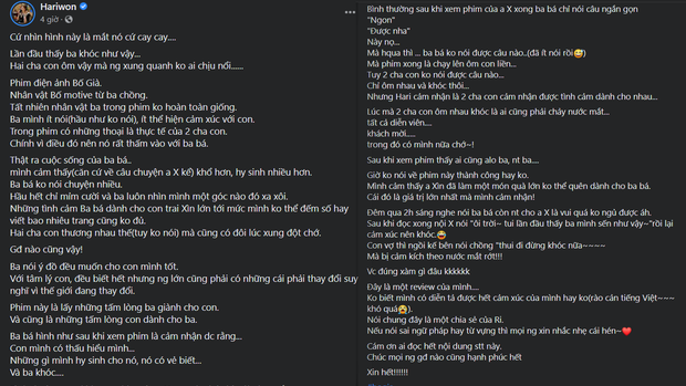 Theo Hari Won chia sẻ, đây là lần đầu tiên cô nhìn thấy ba ruột của Trấn Thành khóc và không nói lên lời sau khi thưởng thức một bộ phim. Bản thân nữ ca sĩ và khách mời cũng vô cùng xúc động khi nhìn thấy cảnh Trấn Thành và bố ôm trầm lấy nhau "khóc nức nở". Cuối bài chia sẻ của mình, Hari Won cũng không quên nói tới rào cản tiếng Việt và mong khán giả sẽ nhắc nhở nhẹ nếu bản thân có sai ngữ pháp.