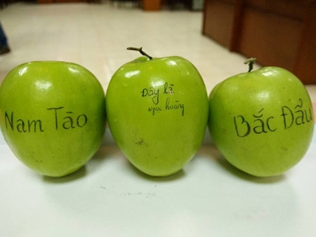 Danh hài Xuân Bắc đã dùng bút viết tên các vai diễn này lên quả táo để các diễn viên tạo dáng. Những khoảnh khắc của các Táo trong buổi tập vô cùng hài hước, dí dỏm.