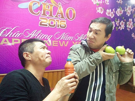 Nghệ sĩ Quang Thắng và Công Lý dí dỏm chơi đùa với những quả táo trong hậu trường |