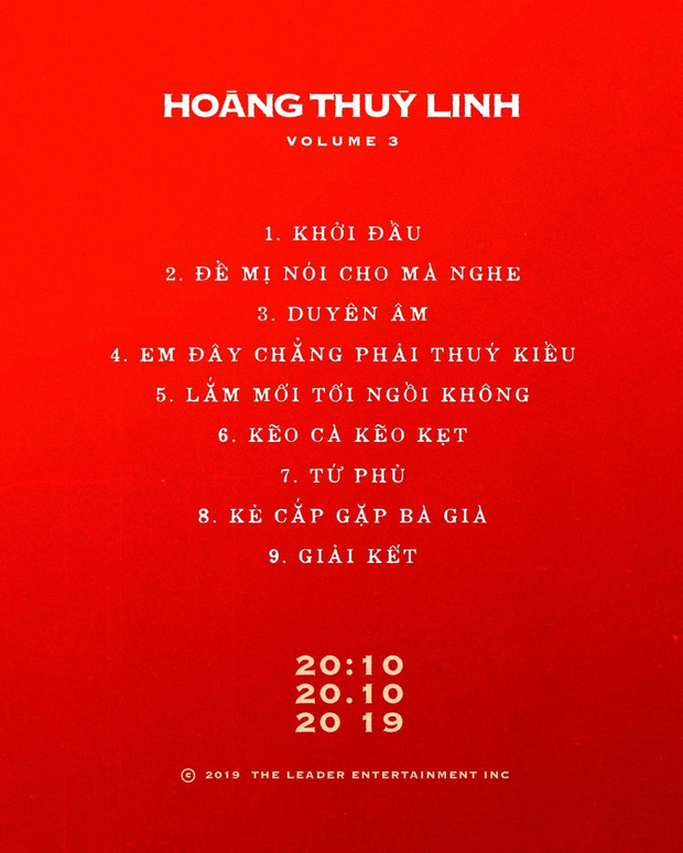Album thứ 3 của Hoàng Thuỳ Linh sẽ được ra mắt vào tối Chủ nhật, 20/10, hứa hẹn là một sản phẩm âm nhạc chất lượng và đầy bùng nổ của đường đua Vpop cuối năm 2019.