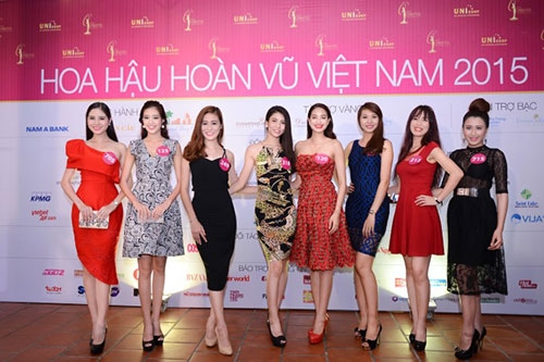 Các người đẹp tham dự buổi họp báo trước vòng bán kết. |