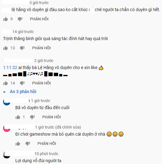 Ngoài ra, khi Trịnh Thăng Bình đang phân tích giọng hát của thí sinh, Lệ Hằng chen ngang ngắt lời và hỏi: 'Sao anh nói nhiều thế?' khiến nam ca sĩ khá ngỡ ngàng. Hành động này của Lệ Hằng vấp phải sự chỉ trích từ khán giả, nhiều người cho rằng cô không chỉ vô duyên mà còn thiếu tôn trọng nghệ sĩ khác.