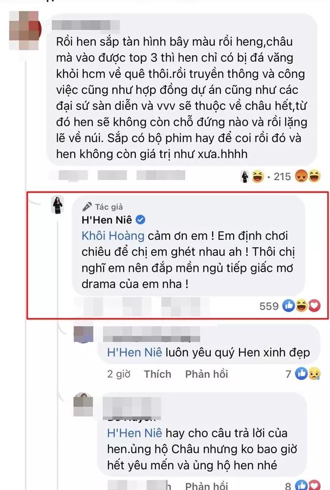 Trước bình luận của anti-fan, H’Hen Niê thay vì im lặng đã có động thái đáp trả. Người đẹp thả "haha" bình luận này và viết: "Cảm ơn em! Em định chơi chiêu để chị em ghét nhau ah! Thôi chị nghĩ em nên đắp mền ngủ tiếp giấc mơ drama của em nha!