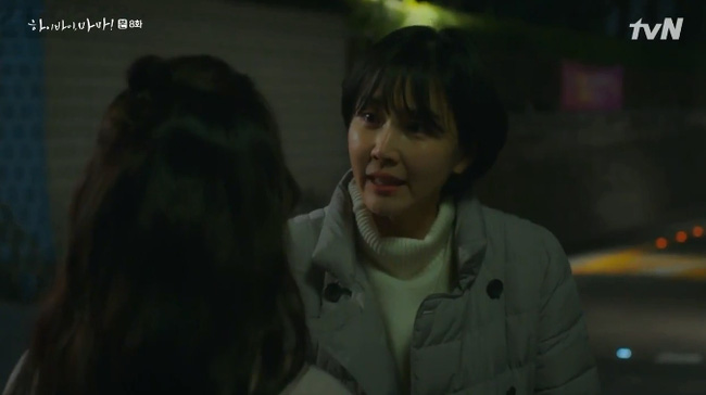 Tập 8 Hi Bye, Mama (Tạm biệt mẹ) mở đầu phân cảnh khá xúc động khi Cha Yoo Ri cho Min Jung đi ké dù, Min Jung đã có thiện cảm hơn với vợ cũ của chồng và trong lần tình cờ gặp nhau này, cô đã quyết định giao Seo Woo cho Yoo Ri làm bảo mẫu.