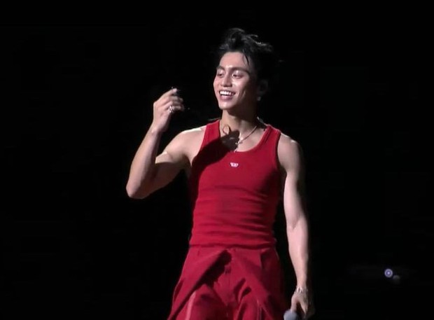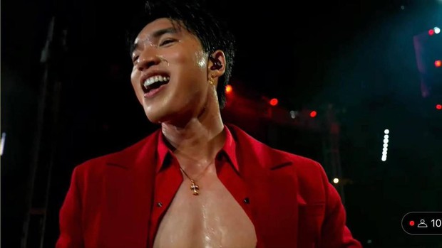 HIEUTHUHAI diện trang phục đỏ từ đầu đến cuối và thể hiện bản hit Ngủ Một Mình. Dù anh chàng chỉ phanh ngực chút xíu nhưng những động tác vũ đạo quyến rũ đã góp phần khiến tiết mục này được bàn tán rất nhiều trên MXH.