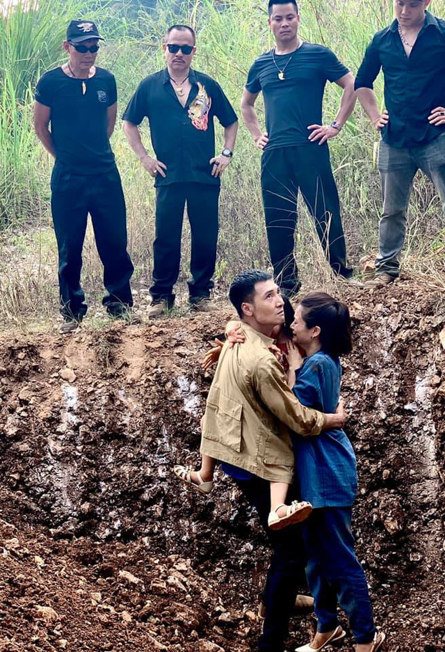Ở bức ảnh mới nhất, Mạnh Trường ôm chặt một người phụ nữ và một đứa trẻ được cho là vợ con. Dường như họ đang bị một nhóm xã hội đen đe dọa chôn sống. Cả trong khi vợ con tỏ ra căng thẳng, sợ hãi thì Mạnh Trường hướng ảnh mặt giận giữ về phía nhóm côn đồ. Người phụ nữ trong bức ảnh chính là diễn viên Kiều Anh - gương mặt đã rất quen thuộc với khán giả và gây ấn tượng mạnh mẽ kể từ bộ phim Phía trước là bầu trời cách đây gần 20 năm.