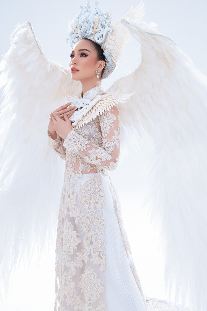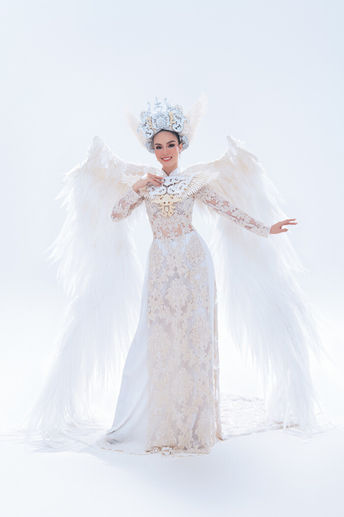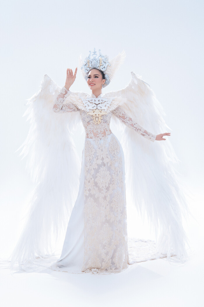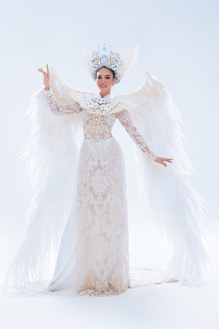 Bộ trang phục lấy ý tưởng từ áo dài, cánh chim cùng thông điệp hòa bình là những hình ảnh rất quen thuộc trong dân gian Việt Nam. Với màu trắng chủ đạo, bộ trang phục thể hiện sự thanh thoát, nhẹ nhàng, vừa quyền lực vừa ấn tượng cũng sẽ là lựa chọn khó để Hoàng Hương Ly thể hiện tại cuộc thi này. Chiếc mấn mà Hương Ly đội cũng là điểm thu hút ánh nhìn họa tiết được khắc họa vô cùng tỉ mỉ, mãn nhãn.