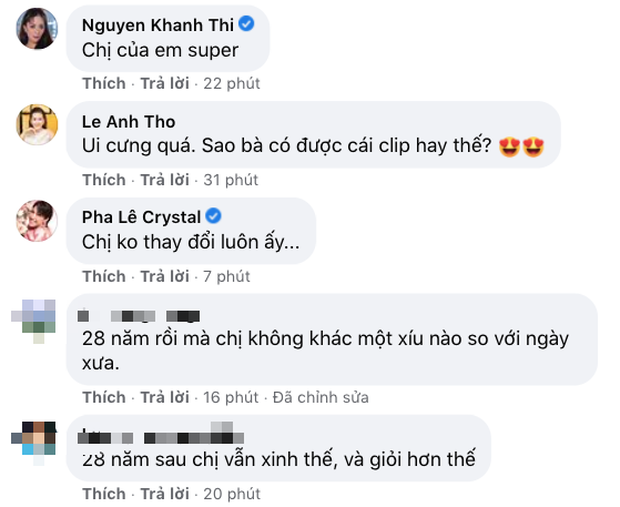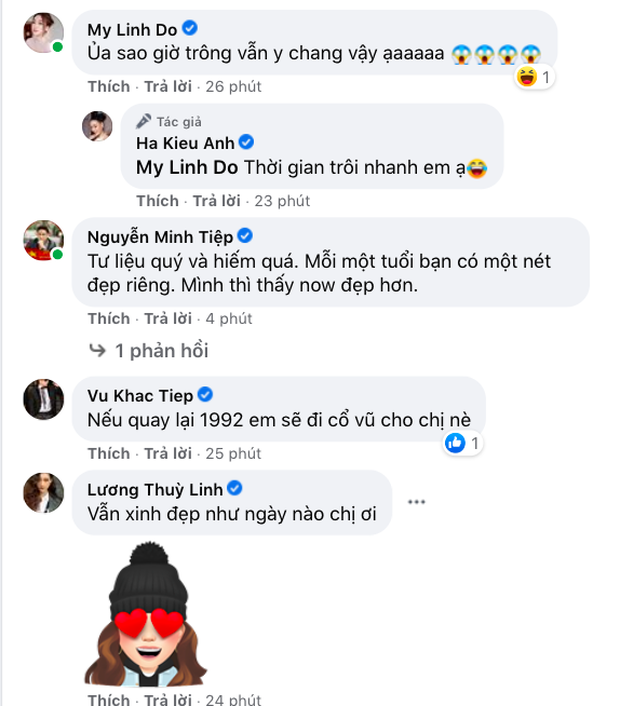 Nhiều sao Việt đã dành lời khen cho nhan sắc bị 'thời gian bỏ quên' của Hà Kiều Anh. "Ủa sao giờ chị vẫn y chang vậy ạ" - Hoa hậu Đỗ Mỹ Linh ngỡ ngàng. "Vẫn đẹp như ngày nào chị ơi", "Chị của em là super", "Nếu quay lại năm 1992 em sẽ đi cổ vũ cho chị" - Lương Thuỳ Linh, Khánh Thi, Vũ Khắc Tiệp để lại bình luận.