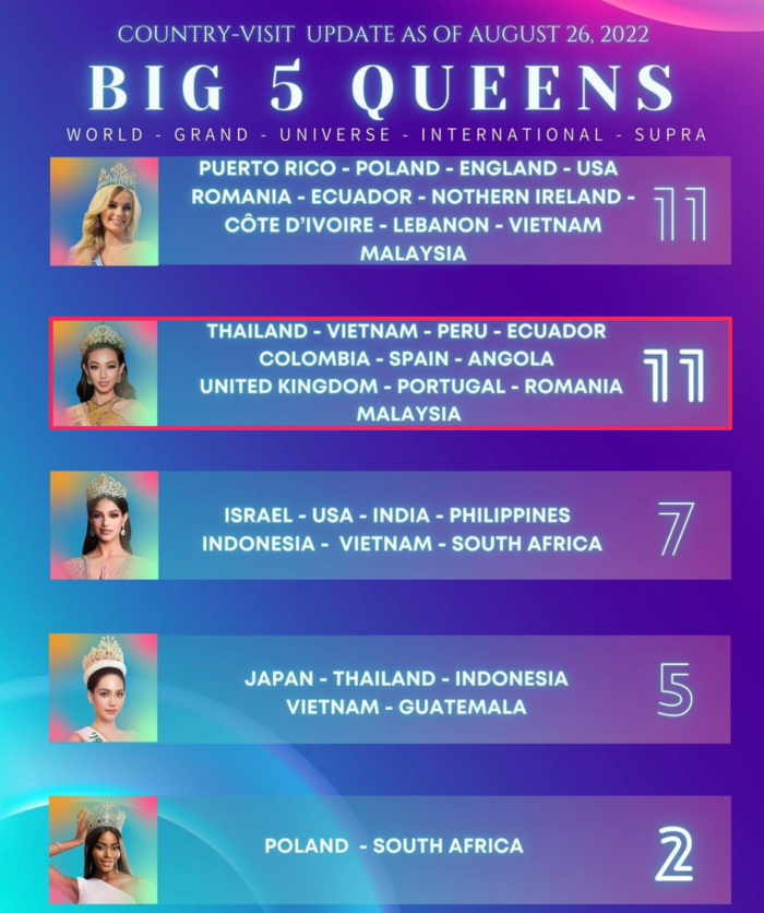 Theo thống kê, sau 10 tháng đăng quang, đương kim Hoa hậu Hoà bình Quốc tế đã ghé thăm 11 đất nước sánh ngang bằng với Hoa hậu Thế giới (Miss World 2021) - Karolina Bielawska. Thậm chí, người đẹp sinh năm 1998 còn vượt mặt cả Hoa hậu Hoàn vũ - Harnaaz Sandhu để đứng hạng 2 trong bảng xếp hạng của 5 đấu trường nhan sắc lớn nhất thế giới.