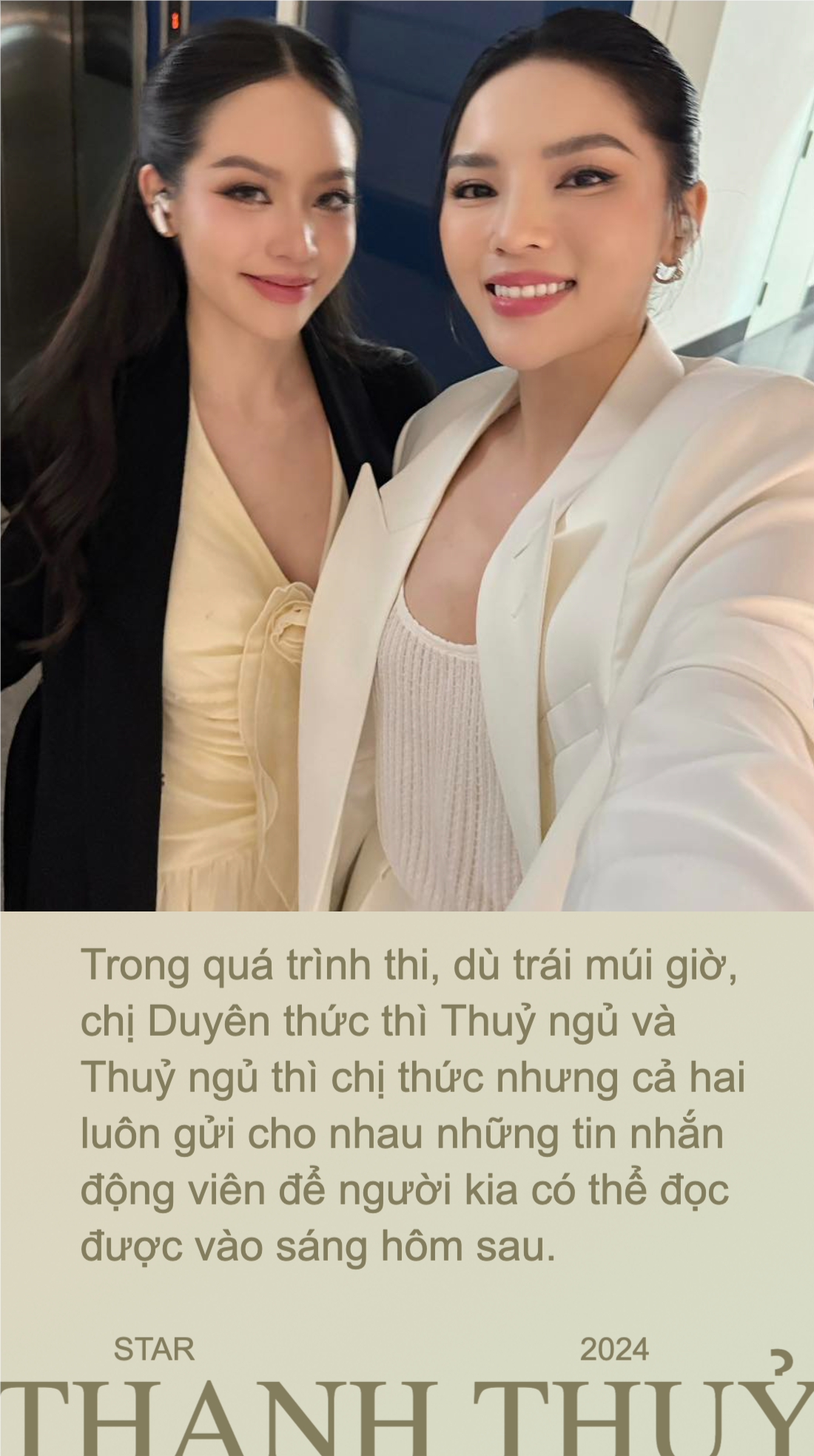 Liên quan đến khoảnh khắc gặp gỡ Kỳ Duyên ở sân bay khi cả hai cùng lên đường chinh chiến quốc tế, người đến Miss International, người đến Miss Universe, Thanh Thuỷ nói: "Khi vào trong Thuỷ và chị Kỳ Duyên đã gọi cho nhau để chụp tấm ảnh đó. Chị Duyên tặng cho Thuỷ chiếc gối ngủ để không bị gục cổ trên máy bay, chị ấy thật sự rất tâm lý và động viên Thuỷ rất nhiều trong hành trình vừa qua. Cả hai không có quá nhiều thời gian nói chuyện với nhau nhưng những thứ chị làm khiến Thuỷ cảm nhận được sự ấm áp. Trong quá trình thi, dù trái múi giờ, chị thức thì Thuỷ ngủ và Thuỷ ngủ thì chị thức nhưng cả hai luôn gửi cho nhau những tin nhắn động viên để người kia có thể đọc được vào sáng hôm sau".