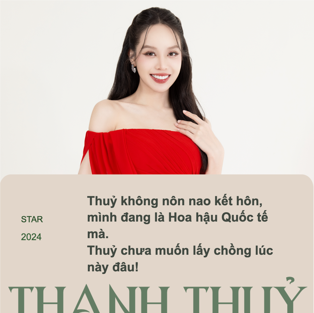 Khi được hỏi về dự định kết hôn thực, Thanh Thuỷ bật cười: "Thuỷ không nôn nao kết hôn, Thuỷ đang là Hoa hậu Quốc tế mà, chưa muốn lấy chồng lúc này đâu. Thuỷ nghĩ đó là duyên số, khi nào thích hợp thì nó sẽ tới chứ không cần nôn".