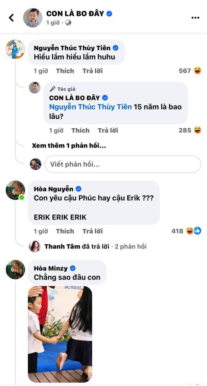 Lập tức, Thùy Tiên vào để xoa dịu bé Bo: "hiểu lầm hiểu lầm", bé Bo cũng lập tức chất vấn: "15 năm là bao lâu?". Hòa Minzy cũng hài hước tiết lộ sau tấm poster này, bé Bo sẽ chỉ yêu "cậu Erik" chứ không thèm yêu "cậu Đức Phúc" nữa. Màn đối đáp tung hứng của bé Bo và mẹ, các cô chú anh chị hài hước khiến netizen không khỏi thích thú.