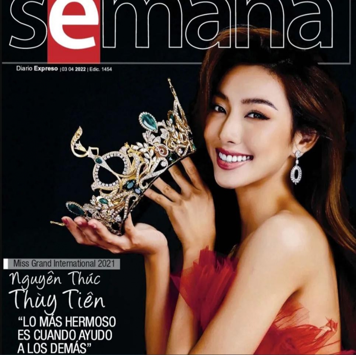 Mới đây, tờ tạp chí tuần Semana của Colombia đã hé lộ gương mặt trang bìa mới nhất của họ chính là Hoa hậu Hòa bình Quốc tế 2021 - Nguyễn Thúc Thùy Tiên. Xuất hiện trên trang bìa là hình ảnh Thùy Tiên diện đầm đỏ rực lộng lẫy, cầm vương miện lung linh và trang điểm vô cùng xinh đẹp. Không những thế, các trang trong của tờ tạp chí này còn dành nhiều trang để giới thiệu và dành lời ngợi khen cho nhan sắc cũng như tài năng của Thùy Tiên.