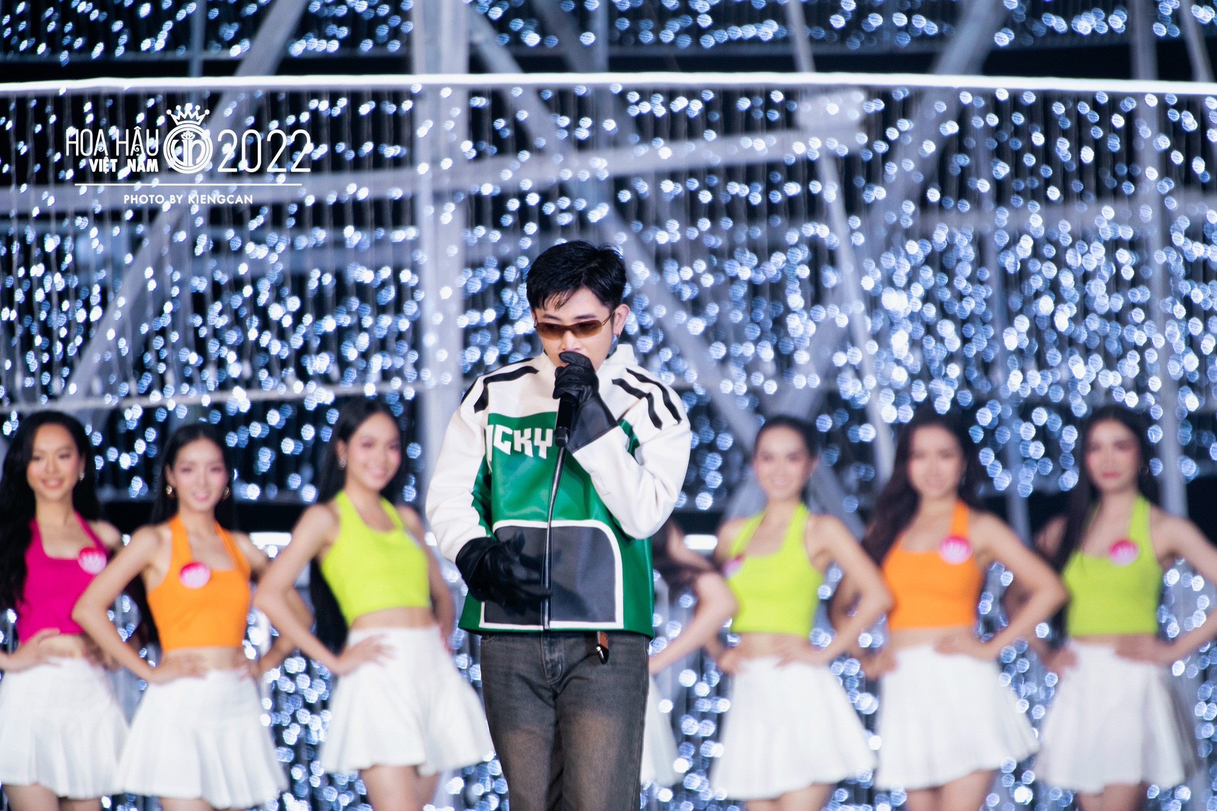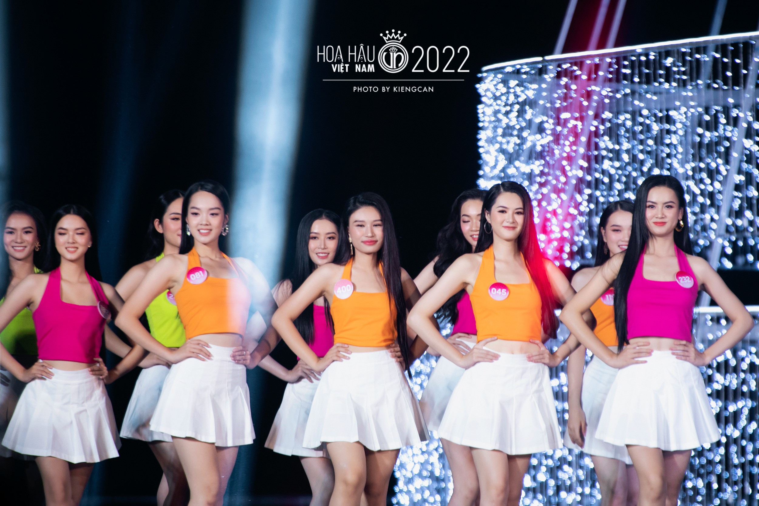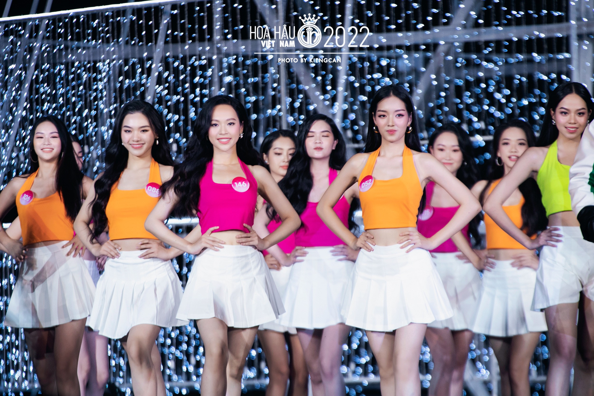 Mở đầu là màn đồng diễn của Top 35 Hoa hậu Việt Nam 2022 trên nền nhạc “Lúc lắc” và “Con nhà người ta” của Ricky Star. Các người đẹp diện trang phục khỏe khoắn kết hợp với chân váy xòe trên gối cùng giày thể thao.