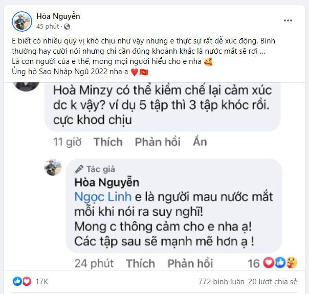 Không im lặng, giọng ca gốc Bắc Ninh trực tiếp đăng tải bình luận của khán giả và giãi bày: 'Em biết có nhiều quý vị khó chịu như vậy nhưng em thực sự rất dễ xúc động. Bình thường hay cười nói nhưng chỉ cần đúng khoảnh khắc là sẽ rơi nước mắt. Là con người của em như thế mong mọi người hiểu cho em nha. Ủng hộ Sao Nhập Ngũ nha cả nhà!'.