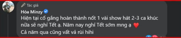 Qua bài đăng, có thể thấy việc hát quá nhiều đã phần nào khiến cho cổ họng của Hòa Minzy bị tổn thương nghiêm trọng. Tuy nhiên, vì khối lượng công việc "quá tải" nên Hòa Minzy đã không có thời gian nghỉ ngơi để khôi phục lại tình trạng thanh quản như bác sĩ đã căn dặn, dẫn đến vấn đề ngày một nghiêm trọng hơn. Sau thông báo hủy 2 show diễn này, Hòa Minzy cũng cho biết mình sẽ cố gắng hoàn thành nốt 1 vài show hát 2-3 ca khúc nữa thì sẽ chính thức nghỉ Tết sớm hơn mọi năm.