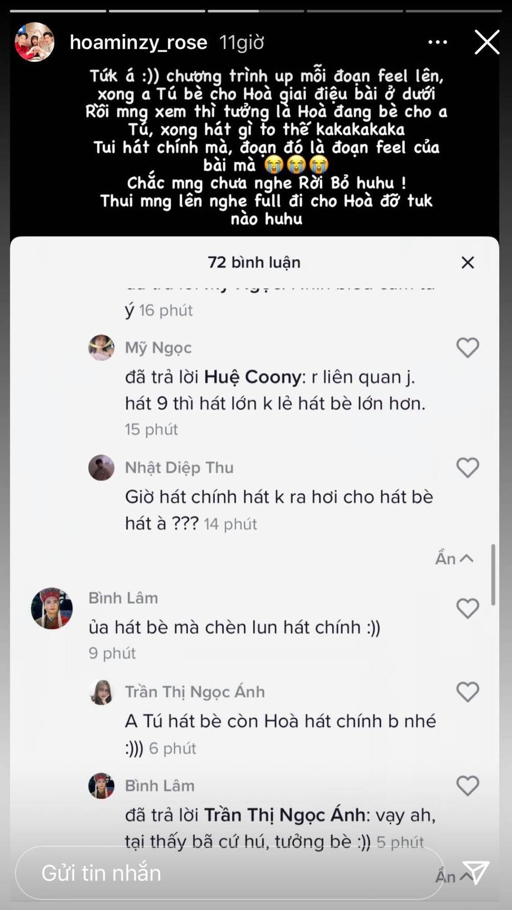 Sau khi nhận được bình luận này, nữ ca sĩ đã nhanh chóng đính chính trên story instagram. Hòa Minzy chia sẻ: "Tức á chương trình đăng mỗi đoạn feel lên, xong Anh Tú bè cho Hòa giai điệu bài ở dưới. Rồi mọi người xem thì tưởng là Hòa đang bè cho Anh Tú, xong hát gì to thế. Hòa hát chính, đoạn đó là đoạn feel của bài. Chắc mọi người chưa nghe Rời bỏ rồi. Thôi mọi người lên nghe full đi cho Hòa đỡ tức nào".