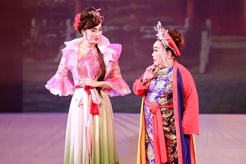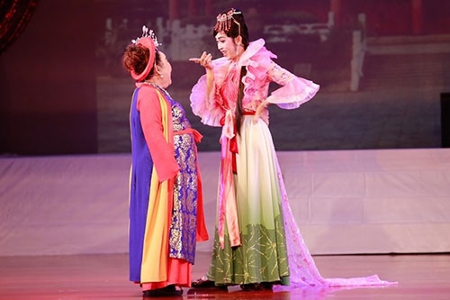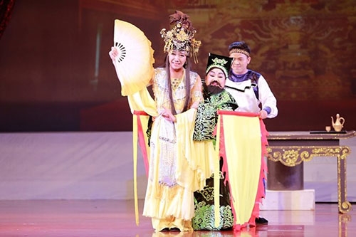 Ngoài tiết mục giả gái của Hoài Linh, MC Trấn Thành cũng chứng tỏ sức hút riêng khi vào vai Điêu Thuyền trong trích đoạn hồ Quảng - Đổng Trác cưới vợ cùng NSND Ngọc Giàu và nghệ sĩ hài Trường Giang. |