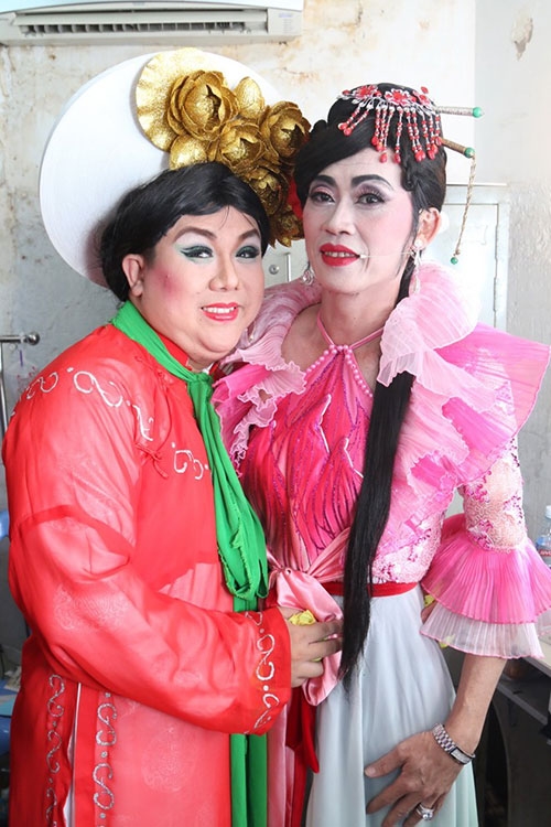 Nhưng cuối năm 2011, anh khiến người hâm mộ bất ngờ và tiếc nuối khi tuyên bố chấm dứt các vai giả gái, nhường lại đất diễn cho các đàn em. Gần 4 năm trôi qua, anh luôn giữ đúng lời hứa. Trong ảnh, Hoài Linh chụp hình cùng diễn viên hài Gia Bảo. |