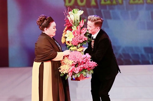 Trên sân khấu, Hoài Linh tung hứng ăn ý với chủ nhân đêm diễn. Trong một số phân đoạn, nam danh hài cũng không nhịn được cười. Nhưng với bản lĩnh làm nghề, anh mau chóng xoay xở để tiếp tục vai diễn một cách duyên dáng. |