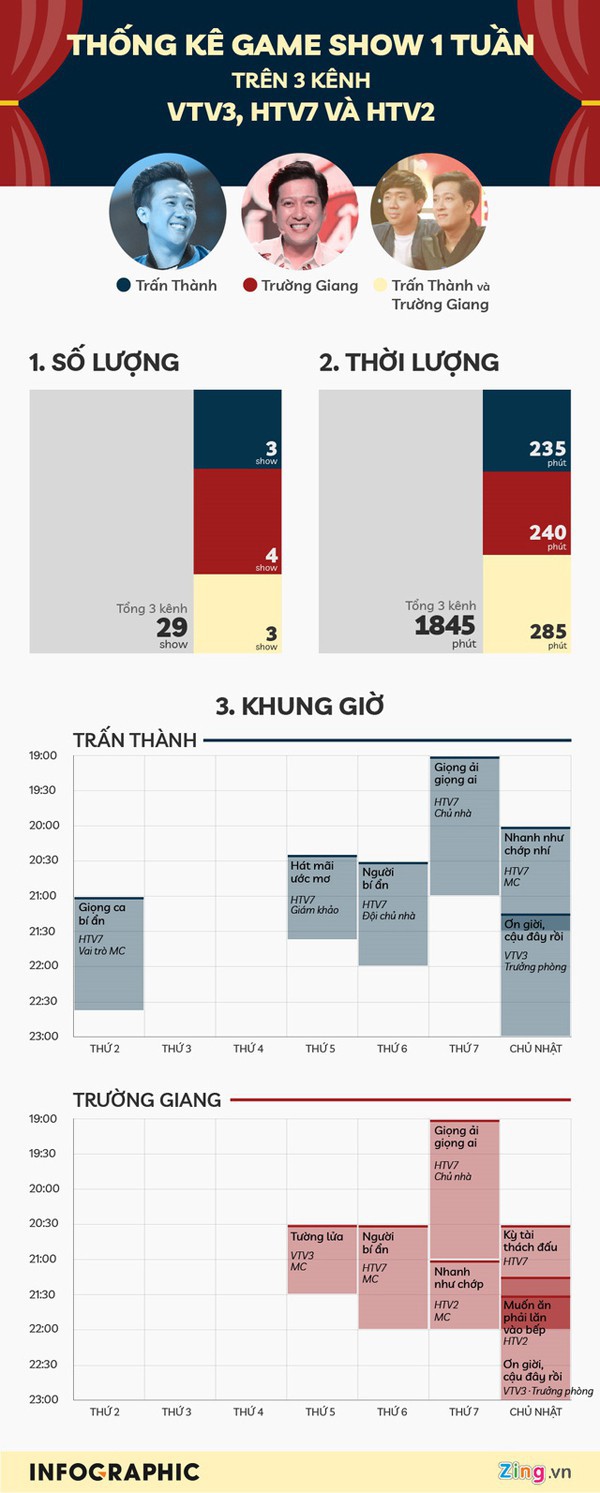 Hiện tại, 2 cái tên đang đắt show và thay thế vị trí cho Hoài Linh chính là Trấn Thành và Trường Giang. Theo bảng thống kê của Zing, Trấn Thành và Trường Giang xuất hiện ở 6-7 game show với nhiều vai trò khác nhau. 2 diễn viên hài được đánh giá đắt show nhất showbiz Việt. Họ chiếm sóng 1845 phút trên 3 kênh: VTV3, HTV7 và HTV2.