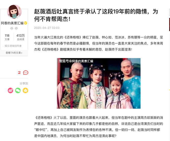 Mới đây Sohu có bài đăng nhắc đến chuyện vì sao Châu Kiệt bị các diễn viên Hoàn Châu Cách Cách ghét bỏ. Trong đó đề cập đến việc Triệu Vy cũng không có mối quan hệ tốt với Châu Kiệt và ở thời điểm nam diễn viên gặp khó khăn, Triệu Vy chẳng hề giúp đỡ anh là vì có nguyên nhân sâu xa.