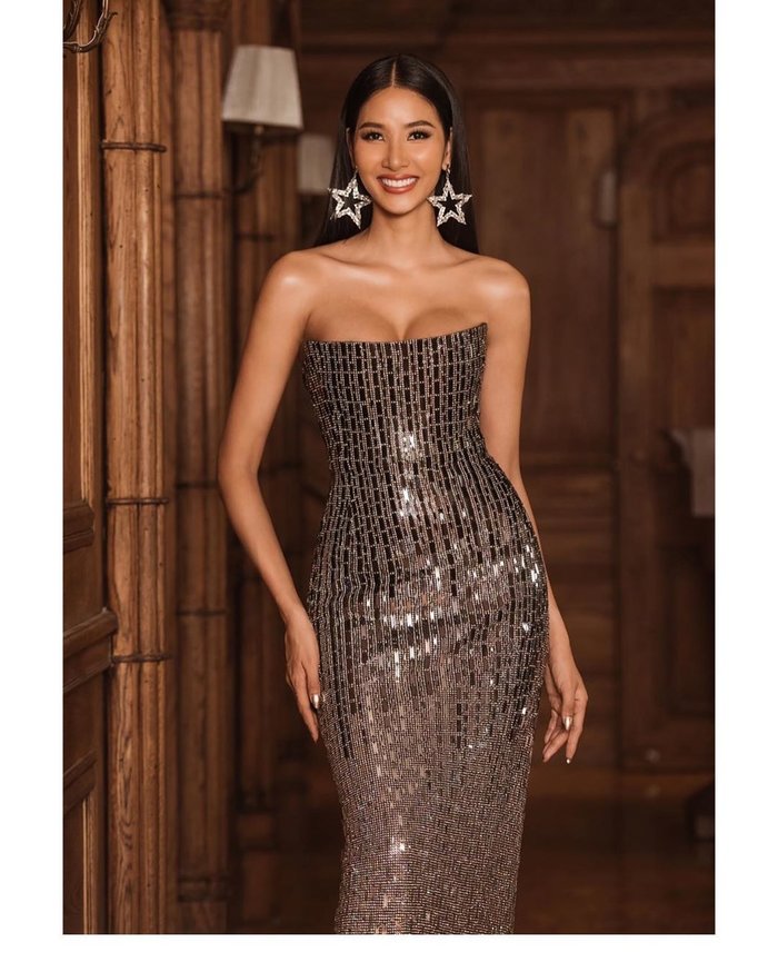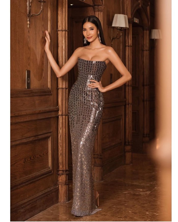 Mới đây, trong bữa tiệc đêm nằm trong khuôn khổ cuộc thi, đại diện Việt Nam vô cùng tỏa sáng với mẫu thiết kế đầm dạ hội ánh kim. Thiết kế này được nhiều người nhận xét là đẹp nhất của Hoàng Thùy trong suốt 4 ngày có mặt tại Londo tham dự Miss Universe.