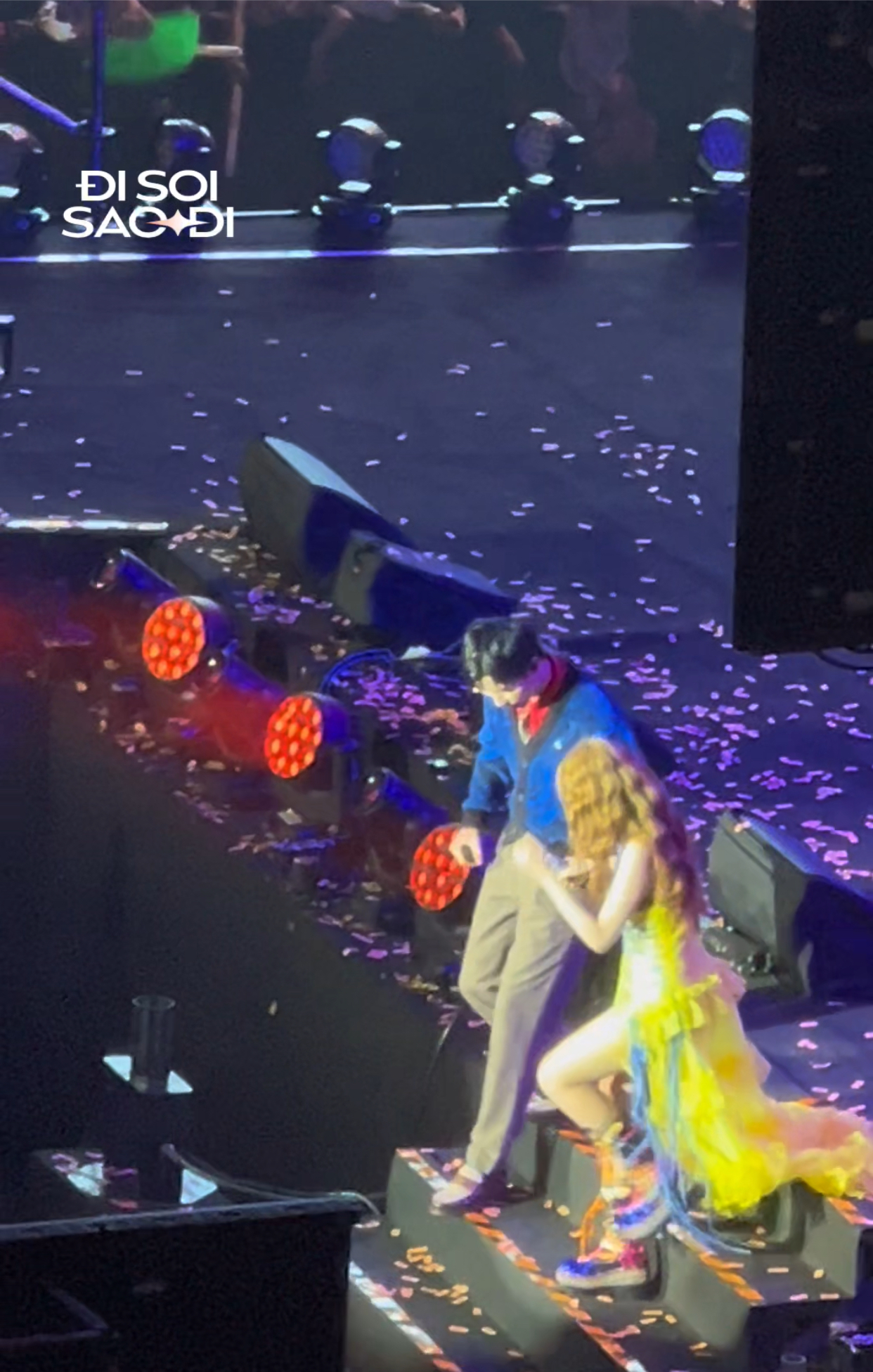 Khoảnh khắc gây "bùng nổ" nhất chính là khi Hoàng Thùy Linh di chuyển xuống cầu thang sân khấu để tặng quà cho người hâm mộ. Đen Vâu không ngần ngại chủ động dìu tay Hoàng Thùy Linh, đảm bảo cô bước đi an toàn. Hành động này ngay lập tức khiến khán giả bên dưới hú hét không ngừng.