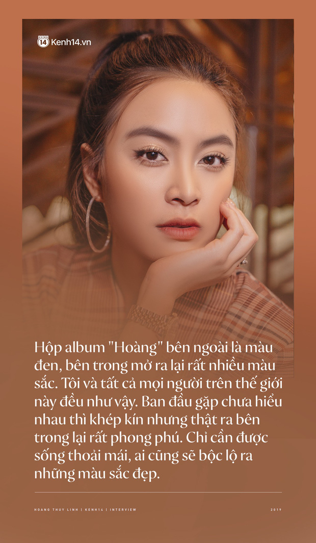 Hộp album "Hoàng" bên ngoài là màu đen, bên trong mở ra lại rất nhiều màu sắc. Con người tôi và tất cả mọi người trên thế giới này đều như vậy. Có thể ban đầu gặp chưa hiểu nhau thì khép kín nhưng thật ra bên trong lại rất phong phú. Chỉ cần được sống thoải mái, ai cũng sẽ bộc lộ ra những màu sắc đẹp.