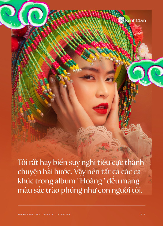Tôi rất hay biến suy nghĩ tiêu cực và những điều khiến mình stress thành chuyện hài hước. Vậy nên tất cả các ca khúc trong album "Hoàng" đều mang màu sắc trào phúng như những suy nghĩ bên trong con người tôi. Một người phụ nữ càng trưởng thành sẽ càng có những nhận định sâu sắc hơn về cuộc đời. Một cô gái trải qua những khó khăn trong công việc, tình yêu sẽ càng hoàn thiện bản thân nhanh hơn. Nhưng trong quá trình hoàn thiện có vui, buồn, đau ấy, hãy cố gắng nghĩ theo hướng tích cực, trào phúng một chút để mọi thứ nhẹ nhõm đi phần nào.