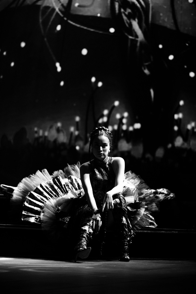 Tại hậu trường, cô nàng xuất hiện với phần ngoại hình long lanh cùng bộ váy được gia công tỉ mỉ, lấy cảm hứng từ câu chuyện phượng hoàng tái sinh từ đống tro tàn. Hoàng Thùy Linh say sưa trình diễn với sự hỗ trợ đắc lực từ các vũ công.