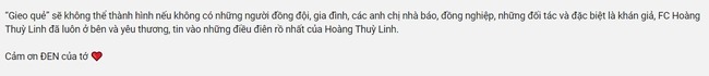 Cụ thể, ở phần giới thiệu MV Gieo Quẻ trên YouTube, sau một bức "tâm thư" khá dài thì Hoàng Thùy Linh đã "chốt hạ" một câu vô cùng tình cảm về nam rapper: "Cảm ơn Đen của tớ", kèm với đó là một biểu tượng trái tim đỏ thắm...