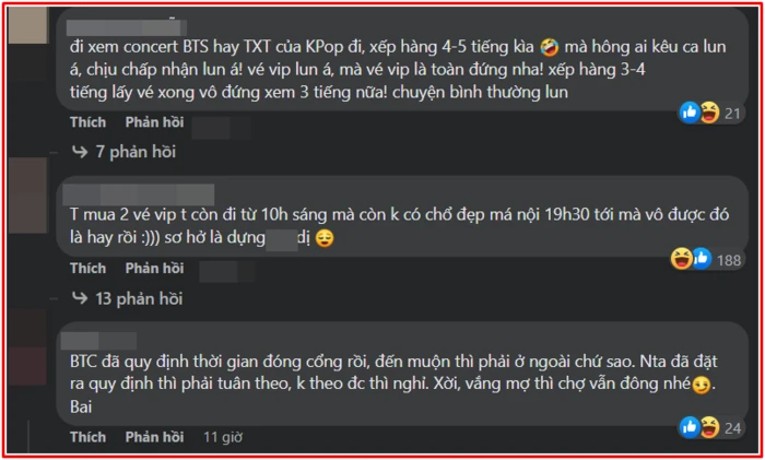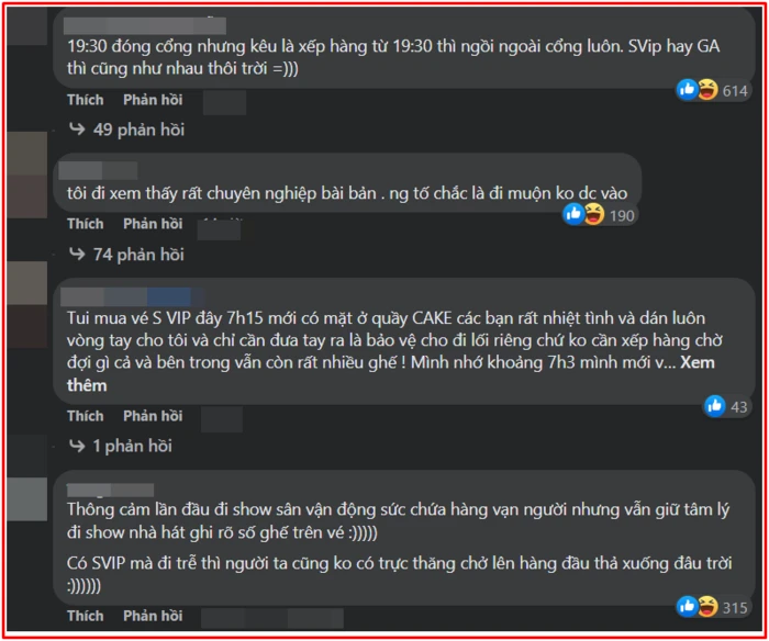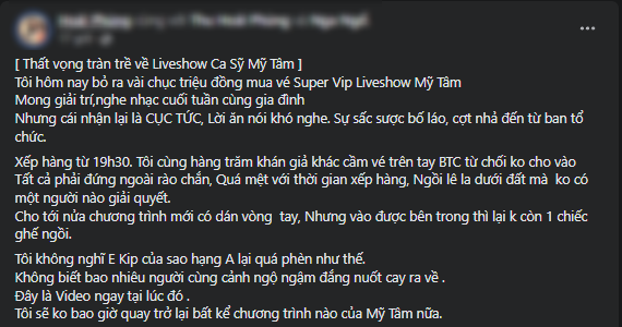 "Tất cả phải đứng ngoài rào chắn, quá mệt với thời gian xếp hàng, ngồi lê la dưới đất mà không một người nào giải quyết. Cho đến 1 nửa chương trình thì mới được dán vòng tay nhưng khi vào được bên trong thì không còn một chiếc ghế ngồi. Tôi không nghĩ ê-kíp của sao hạng A lại quá p.h.è.n như thế. Tôi sẽ không bao giờ quay trở lại bất kể chương trình nào của Mỹ Tâm nữa" - vị khán giả bức xúc.