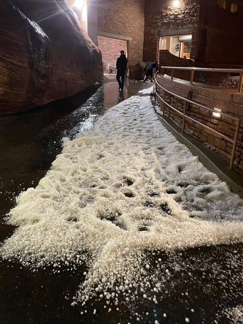 Đoạn video được người hâm mộ quay lại và chia sẻ trên mạng xã hội gây sốc. Trận mưa xối xả và mưa đá to bằng quả bóng golf dữ dội đến mức giống như một bộ phim thảm họa.