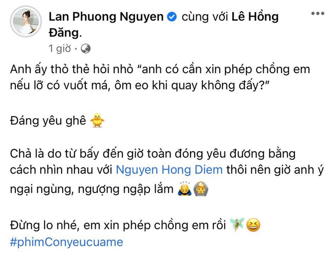 Trong khi đó Lan Phương tiết lộ dự án mới có tựa là "Con yêu của mẹ". Nữ diễn viên đăng ảnh thân thiết bên Hồng Đăng kèm chia sẻ: "Anh ấy thỏ thẻ hỏi nhỏ 'anh có cần xin phép chồng em nếu lỡ có vuốt má, ôm eo khi quay quay không đấy?". Đáng yêu ghê!