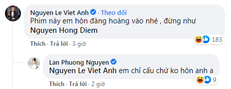 Bài đăng của Lan Phương thu hút nhiều tương tác bình luận của khán giả và đồng nghiệp. Đáng chú ý, diễn viên Việt Anh trêu chọc Lan Phương nhưng cũng không quên 'cà khịa' Hồng Diễm khi bình luận: 'Phim này em hôn đang hoàng vào nhé, đừng như Hồng Diễm'. Đáp lại, Lan Phương viết: 'Em chỉ cấu chứ không hôn'.