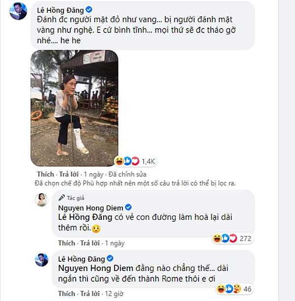 Theo đó, Hồng Đăng khuyên bạn diễn: "Đánh được người mặt đỏ như vang, bị người đánh mặt vàng như nghệ. Em cứ bình tĩnh, mọi thứ sẽ được tháo gỡ nhé!". Đáp lại, Hồng Diễm viết: "Có vẻ con đường làm hòa lại dài thêm rồi". Chốt lại, Hồng Đăng bình luận: "Đằng nào chẳng thế, dài ngắn thì cũng về đến thành Rome thôi em ơi".