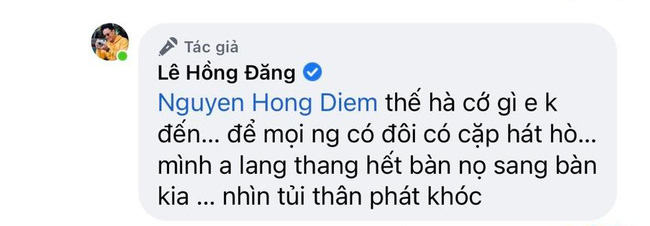 Hồng Diễm đáp lại 'người tình màn ảnh': "Em béo có số có má rồi thì sợ gì béo?". Tiếp đó, Hồng Đăng ngậm ngùi bình luận: "Thế hà cớ gì em không đến? Để mọi người có đôi có cặp hát hò... mình anh lang thang hết bàn nọ sang bàn kia... nhìn tủi thân phát khóc!".