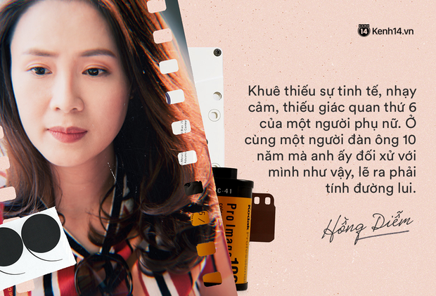 Nếu tôi là Khuê thì tôi sẽ không như vậy. Khuê thu mình, khép mình quá. Tất nhiên là nếu có xuất phát điểm và hoàn cảnh như Khuê thì mình sẽ có những mặc cảm riêng. Cái không may mắn của Khuê là gặp phải người đàn ông không tốt mà không hề hay biết, có lẽ cô ấy thiếu sự nhạy cảm, thiếu giác quan thứ 6 của một người phụ nữ. Ở cùng một người đàn ông 10 năm mà anh ấy đối xử với mình như vậy, lẽ ra cô ấy sẽ phải tính đường lui, tôi nghĩ ngoài cuộc sống sẽ như vậy. Còn trên phim thì tất nhiên phải đẩy nhân vật đến tận cùng để đem đến thông điệp cho khán giả.