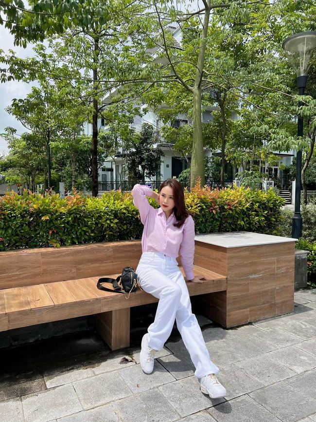 Trong những bức ảnh mới được chia sẻ, Hồng Diễm diện trang phục đơn giản, năng động, màu sắc tươi sáng với sơ mi hồng pastel và quần jeans trắng mix cùng giày thể thao. Hồng Diễm cũng trở lại với mái tóc dài, uốn xoăn bồng bềnh quyến rũ.