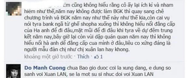 Nếu ai là fan cứng của cuộc thi Vietnam's Next Top Model từ những ngày đầu thì sẽ biết đến trận khẩu chiến trên mạng xã hội giữa các giám khảo mùa 1 và NTK Đỗ Mạnh Cường của mùa 2, siêu mẫu Xuân Lan thì chỉ được nhắc đến gián tiếp.