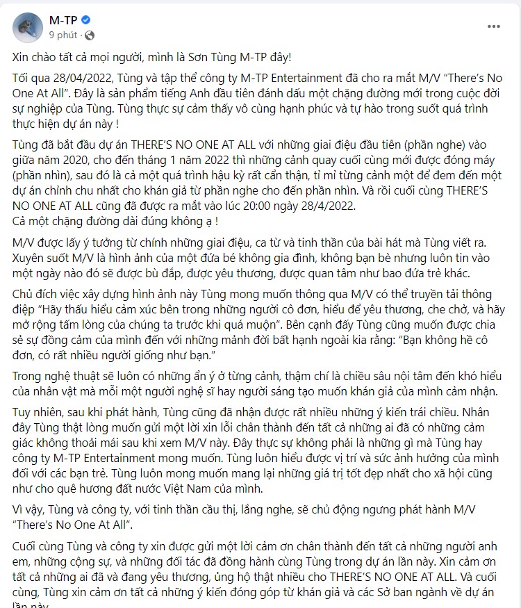 30/04/2022 02:35HOT: Sơn Tùng M-TP chính thức lên tiếng xin lỗi và xác nhận ngừng phát hành MV 'There’s No One At All' sau hàng loạt tranh cãi