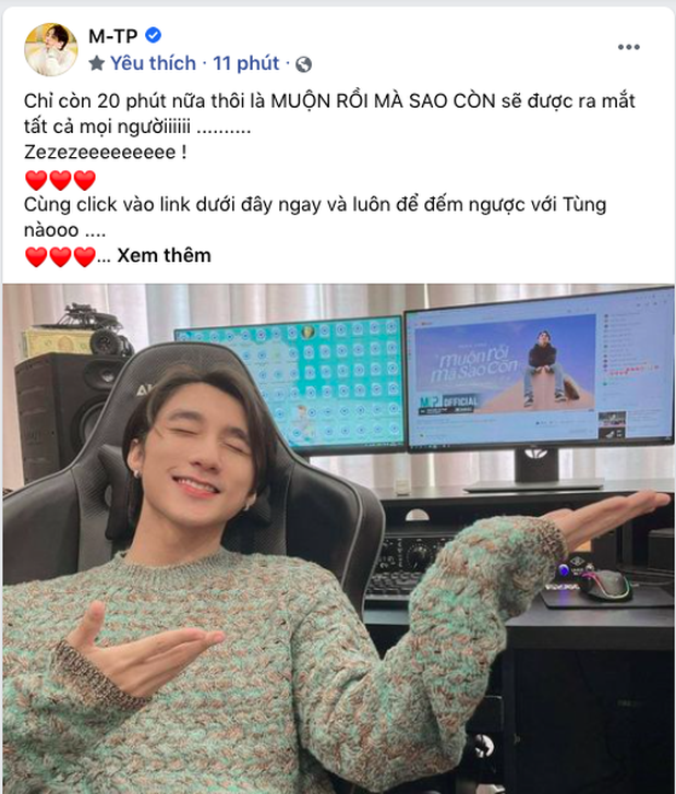 Vừa qua, Sơn Tùng M-TP đã tung ra bản live Muộn Rồi Mà Sao Còn trong buổi livestream Giật Mình Lần 1. Đây là lần hiếm hoi nam ca sĩ "thay đổi chiến thuật" không tung MV mà hé lộ bản audio gây tò mò cho các fan. Giữ đúng lời hứa, đúng 21h57' ngày 29/4, Sơn Tùng M-TP chính thức tung ra MV Muộn Rồi Mà Sao Còn trên kênh YouTube. Ngay từ thời điểm chưa công chiếu, đã có tới hàng chục nghìn người chực chờ để đón chào sản phẩm âm nhạc đầu tiên trong năm 2021 của nam ca sĩ.