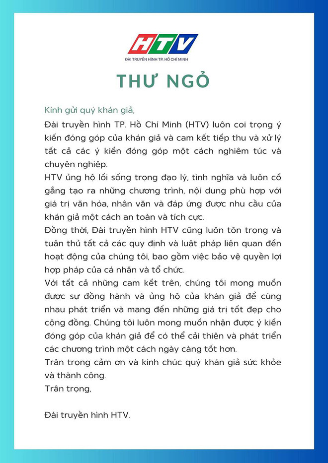 Ngày 4/7, trên fanpage chính thức, HTV gửi một thư ngỏ cho khán giả. Trong văn bản, nhà đài không nêu cụ thể hay đề cập trực tiếp đến sự việc hay nghệ sĩ nào, nhưng nhấn mạnh “Đài truyền hình TP.HCM (HTV) luôn coi trọng ý kiến đóng góp của khán giả và cam kết tiếp thu và xử lý tất cả các ý kiến đóng góp một cách nghiêm túc và chuyên nghiệp".