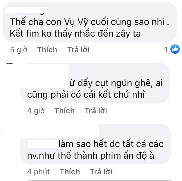 Ngoài ra, khán giả cũng thắc mắc cái kết dành cho Diễm Loan, hai chị em Minh - Trí sẽ phản ứng thế nào khi biết mẹ mắc ung thư, ông Vụ và Vỹ sẽ nhận quả báo ra sao... Nhiều khán giả cũng cho rằng phim kết hơi vội vàng và đặc biệt là cặp Châu - Kiên quay lại với nhau quá nhanh và khiên cưỡng.