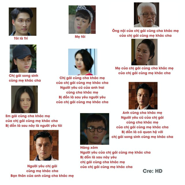 Ví dụ như Châu - chị gái vốn chỉ là cùng cha khác mẹ với Trí nay lại thành chị gái cùng cha khác mẹ của chị gái cùng mẹ khác cha với anh, rồi lại còn là người yêu cũ của anh trai cùng cha khác mẹ.