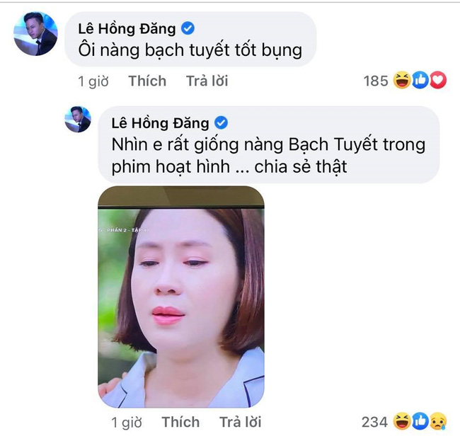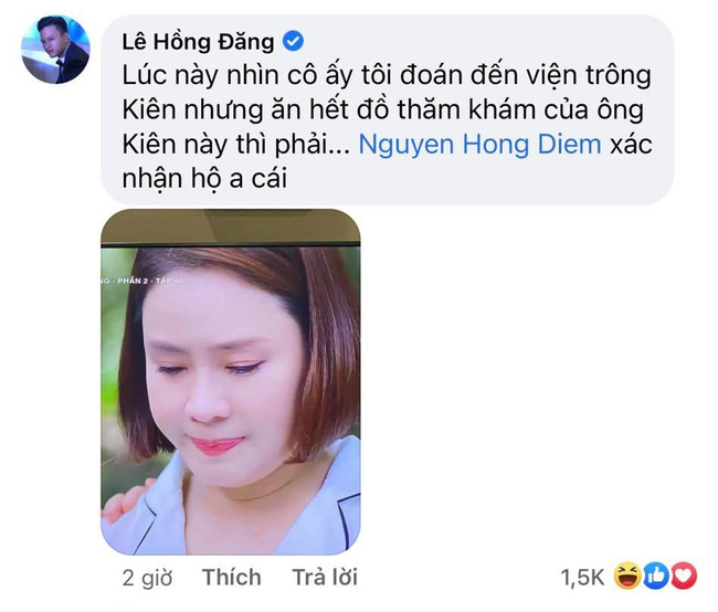 Đáng chú ý, dân mạng không khỏi bật cười với màn tương tác đầy 'mùi cà khịa' của cặp đôi Hồng Đăng - Hồng Diễm. Bên dưới bài đăng cảm ơn khán giả và hẹn gặp ở dự án khác, Hồng Đăng lại đăng ảnh chụp lại khoảnh khắc 'mặt nọng' của Hồng Diễm trong tập cuối và kèm chú thích hài hước: ''Lúc này nhìn cô ấy tôi đoán đến viện trông Kiên nhưng ăn hết đồ thăm khám của ông Kiên này thì phải. Nguyễn Hồng Diễm xác nhận hộ anh cái'.